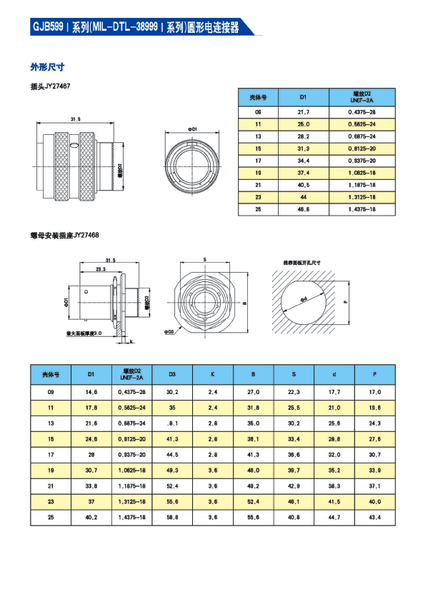 JY27468E15F15SN螺母安裝插座 * 符合GJB 599A(MIL-DTL-38999K)Ⅰ 系列* 卡口式快速連接 * 體積小,重量輕,接觸偶密度高 * EMI / RFI 屏蔽 * 接觸件壓接可取卸,防斜插設(shè)計 * 插座有盒式、墻式、前裝、后裝及螺母緊固式安裝等多種形式 * 具有抗高強度振動特性 * 符合GJB 1784A的標準尾部附件 * 適用于屏蔽電纜夾緊的專用尾部附件(Ti-Ni合金記憶環(huán)) * 9種殼體號,74種孔組排列 * 插合面界面及尾部具有密封結(jié)構(gòu),三防性能優(yōu)良,防護等級可達到IP65 ![]()