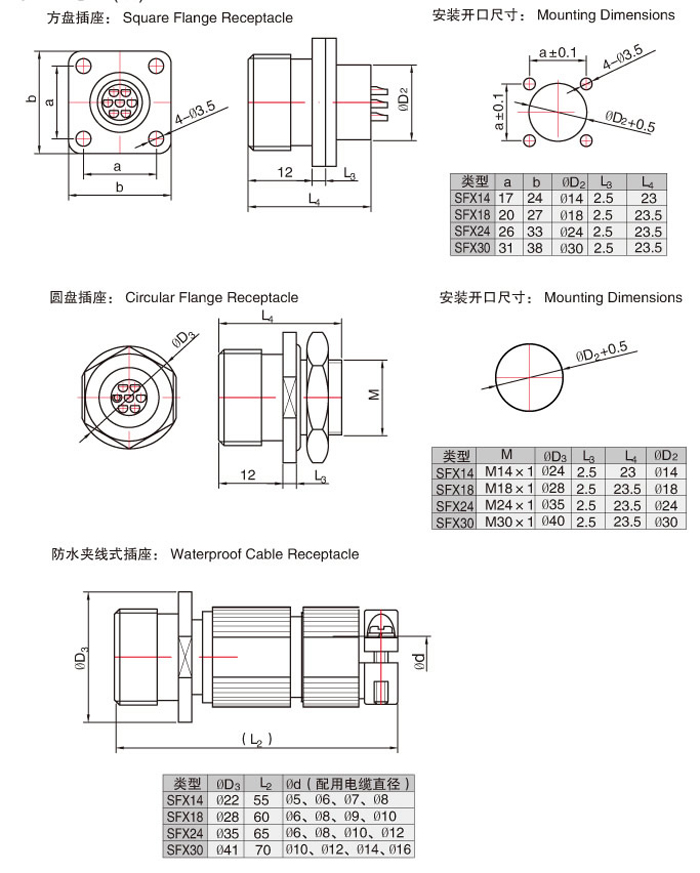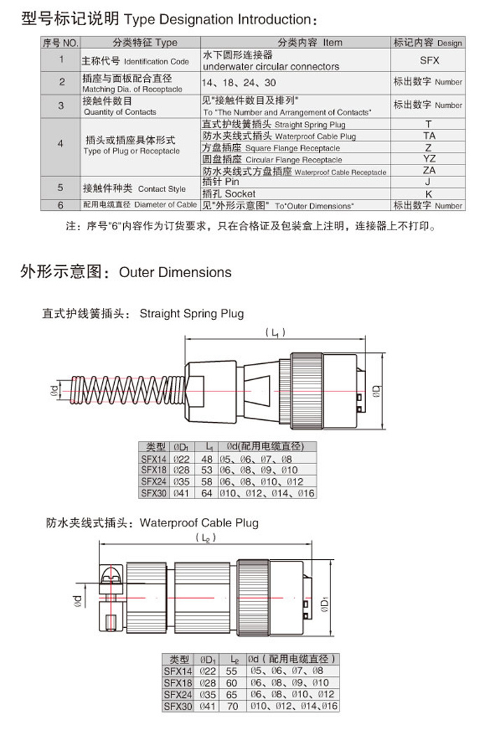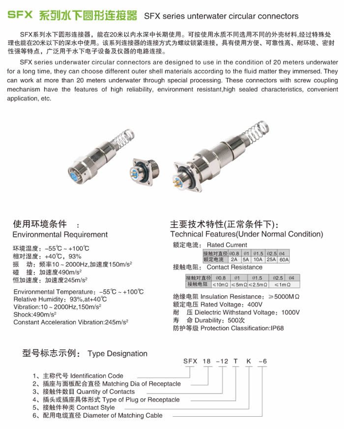 SFX型水密航空插頭座,能在20米以內(nèi)水深中使用的,可按使用水質(zhì)不同選用不同的外殼材料,經(jīng)過特殊處理也能在20米以下的深水中使用。該系列連接器的連接方式為螺紋鎖緊連接,具有使用方便、可靠性高、耐環(huán)境、密封性強(qiáng)等特點(diǎn),廣泛用于水下電子設(shè)備及儀器的電路連接。(SFX是螺紋連接,并且在FQN型的基礎(chǔ)上作了必要的加強(qiáng)。SFX型水下連接器的尾部附件,推薦差用FQN型的A型夾線板式,因?yàn)橛糜谒滤煽。與FQN相比,F(xiàn)QN的優(yōu)勢(shì)是:快速分離與連接和防自動(dòng)脫落。SFX型的優(yōu)勢(shì)是:防水可靠和堅(jiān)固耐用。)http://www.oxxtecy.cn
