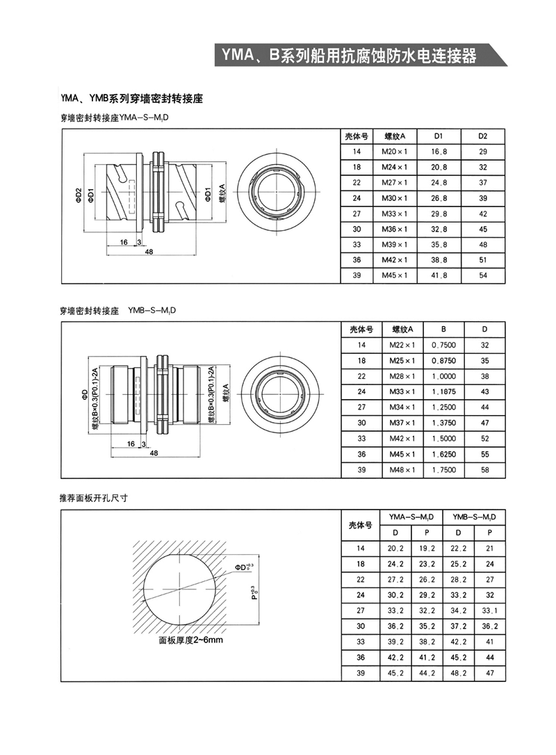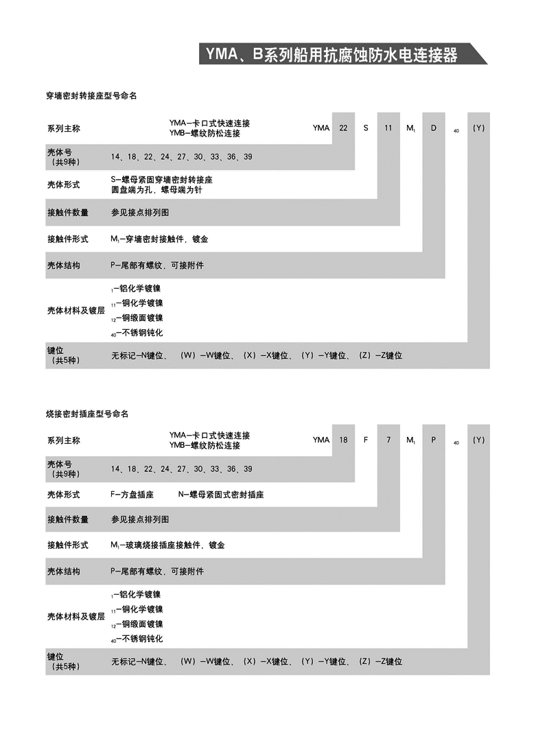 YMA YMB圓形防水防腐航空插頭,適用于濕熱、浸水等惡劣環(huán)境,可耐50米水深密封,耐1000小時(shí)鹽霧試驗(yàn):YMA系列為卡口式快速連接,YMB系列為螺紋防松連接,頭座均為焊接。 YMA、YMB系列船用抗腐蝕防水電連接器 1.【概 述】 * YMA系列—— 卡口式快速連接 * YMB系列—— 螺紋防松連接 * 適用于潮濕、浸水等惡劣環(huán)境下的設(shè)備與電纜、電纜與電 纜之間的電氣連接 * 可耐50米水深密封 * 插頭插座端接方式均為焊接 * 五鍵定位具有盲插和防錯(cuò)插功能 * 高可靠的雙曲面線簧插孔使連接器插拔柔和,接觸電阻小 * 插頭、插座既可裝針,也可裝孔 http://www.oxxtecy.cn/Product/yuanxinghangkongchatouhangkongjiechajian/