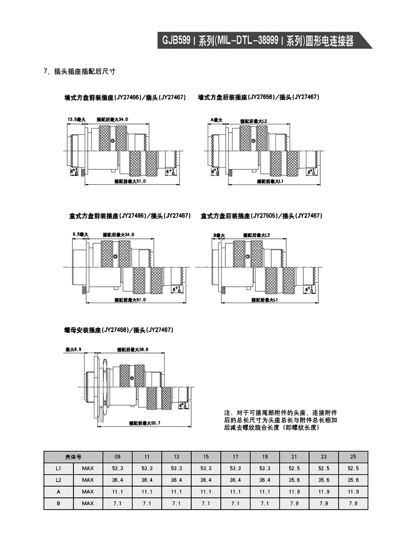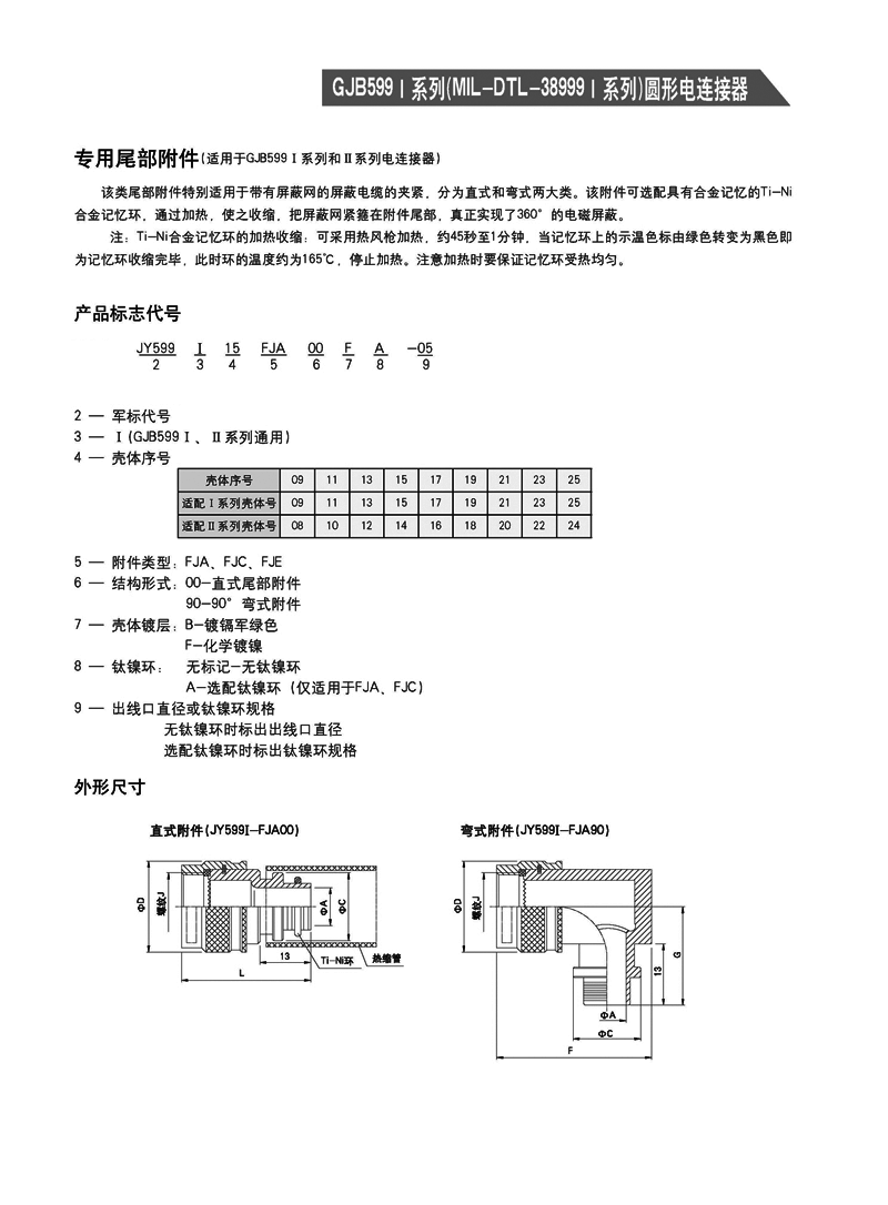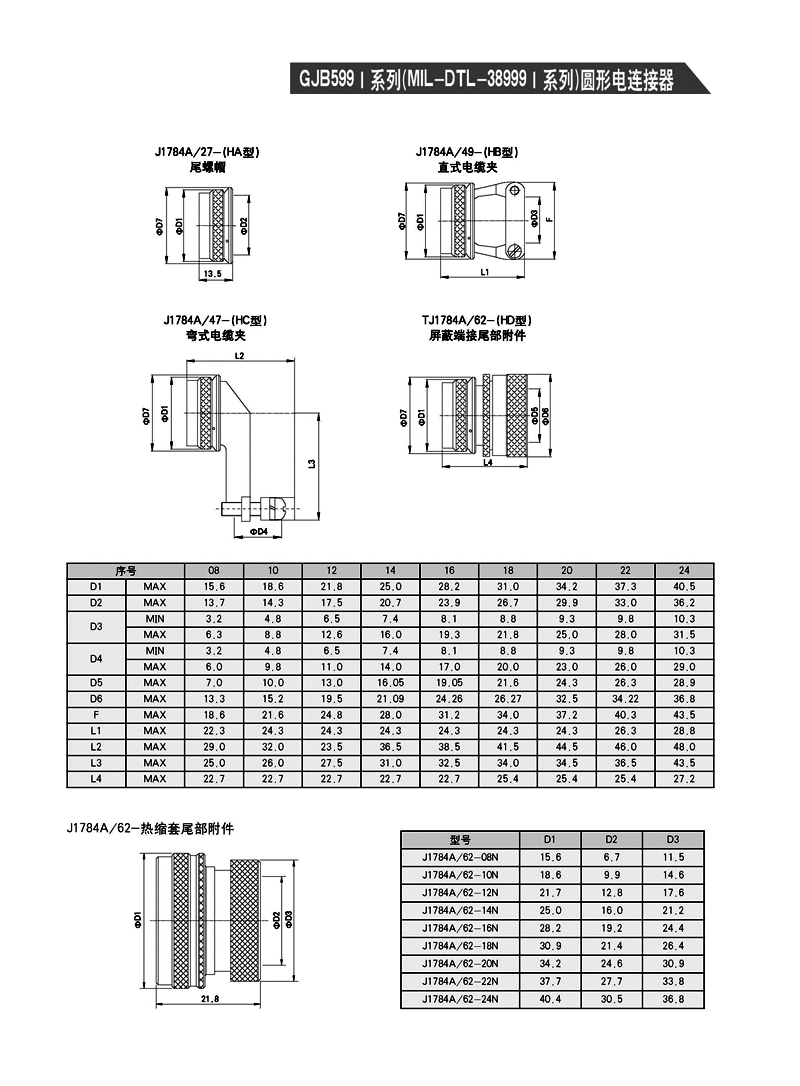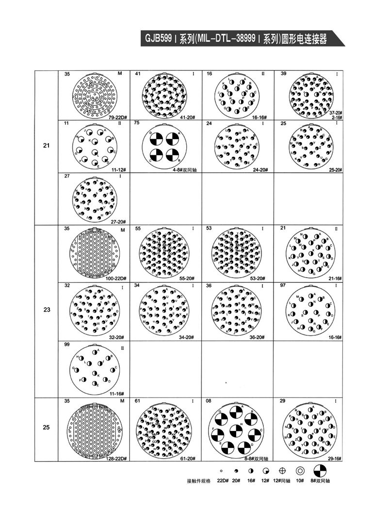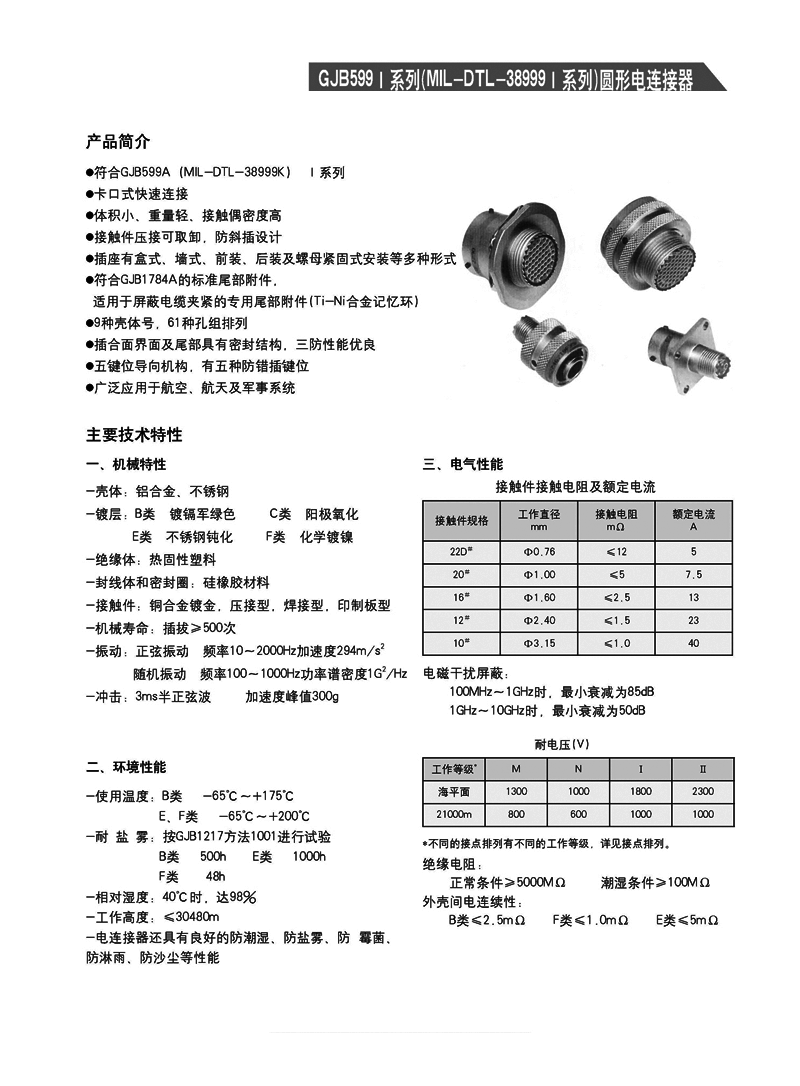 * 符合GJB 599A(MIL-DTL-38999K)Ⅰ 系列 * 卡口式快速連接 * 體積小,重量輕,接觸偶密度高 * EMI / RFI 屏蔽 * 接觸件壓接可取卸,防斜插設(shè)計 * 插座有盒式、墻式、前裝、后裝及螺母緊固式安裝等多種形式 * 具有抗高強度振動特性 * 符合GJB 1784A的標(biāo)準(zhǔn)尾部附件 * 適用于屏蔽電纜夾緊的專用尾部附件(Ti-Ni合金記憶環(huán)) * 9種殼體號,74種孔組排列 * 插合面界面及尾部具有密封結(jié)構(gòu),三防性能優(yōu)良,防護等級可達到IP65 * 五鍵位導(dǎo)向機構(gòu),有五種防錯插鍵位 * 廣泛應(yīng)用于航空、航天、兵器等軍事系統(tǒng)及其他電子設(shè)備系統(tǒng)