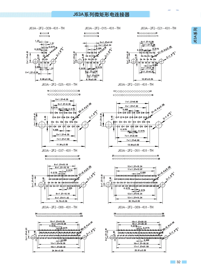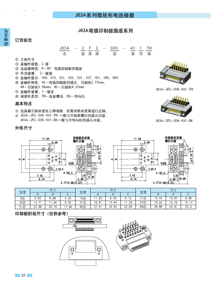 J63A 型90°彎插印制板航空連接器,端接方式是印制板,而且是90°彎腳,座殼體與墻體正常安裝,印制板平行放置,與插針直接焊接。要說明的是印制板可以立著放,這時(shí)選用直式插針焊接。以下是選購(gòu)圖: