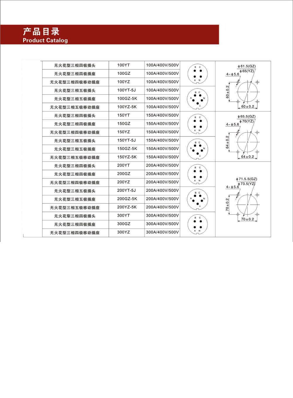 4芯300A防爆防火花航空電連接器,由插頭和插座兩部分組成,其中插頭為移動(dòng)式(YT),插座有3種形式選擇:①面板固定式(GZ)、②移動(dòng)式(YZ)和③斜式固定式。