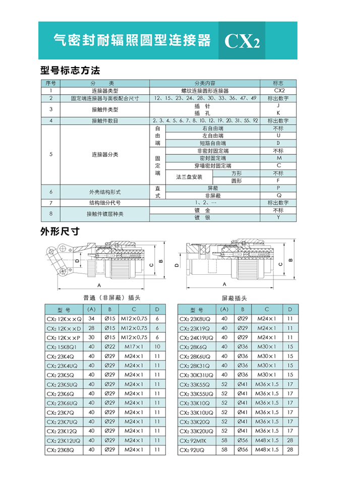 密封穿墻電連接器主要用于氣密座艙及其他電氣、無(wú)線電設(shè)備,需要保持氣密性能穿過(guò)墻壁的電連接。 CX2系列8芯真空密封插座目前有七個(gè)殼體號(hào),二十九個(gè)孔組數(shù),有非密封、密封和密封穿墻等品種。尾部附件有直式壓線式、護(hù)線管式、彎式壓線式和屏蔽式四個(gè)品種;除以上四種形式的尾部附件外,還設(shè)計(jì)了 種尾部附件形式,供用戶選用。