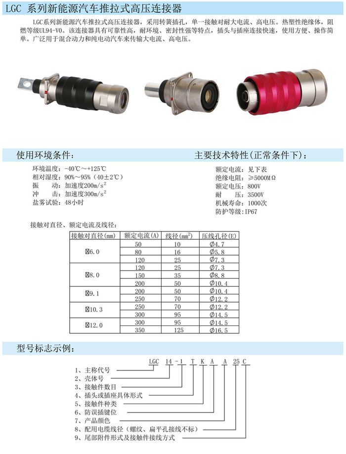YGC型新能源汽車高壓電連接器,是根據(jù)市場的需求開發(fā)成功的產(chǎn)品,推拉式連接,快捷方便。與電纜線端接有壓接式,繞接式,固定式三種,種類多,功能各不一樣,插針緊湊,無打火花現(xiàn)象,耐高壓,廣泛用于新能源汽車線路的連接,電源的輸送,即充電。
