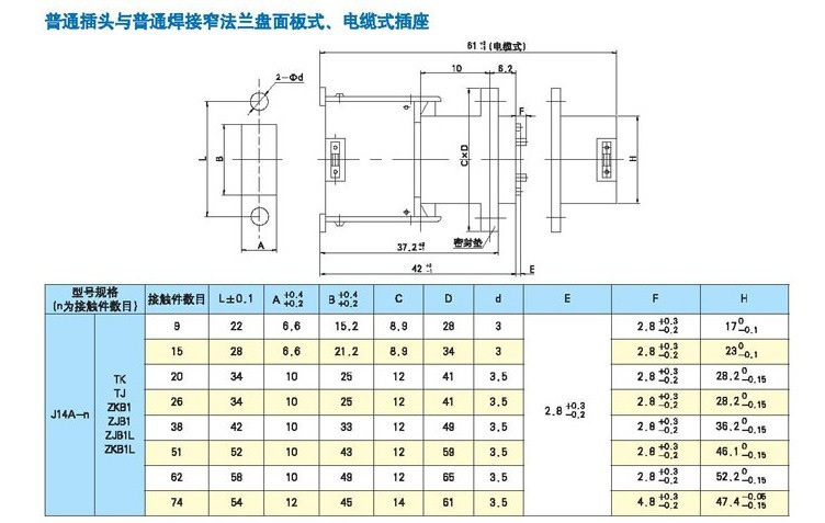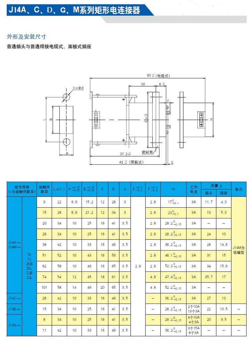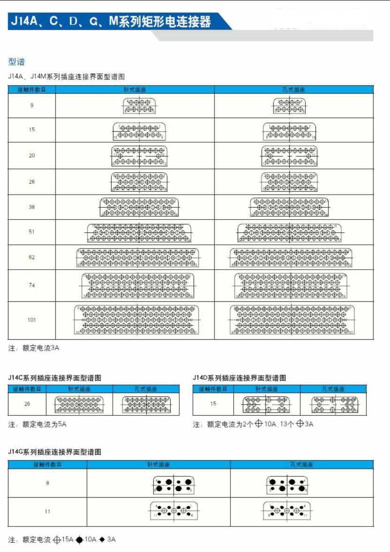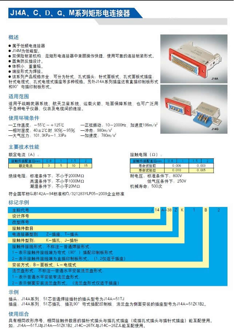 J14系列矩形航空插頭,規(guī)格齊全,可分為針式、孔式插頭;針式面板式、孔式面板式插座;針式電纜式、孔式電纜式插座等多種規(guī)格。另外J14A系列插座還有直插印制板形式和90°彎插印制板形式。