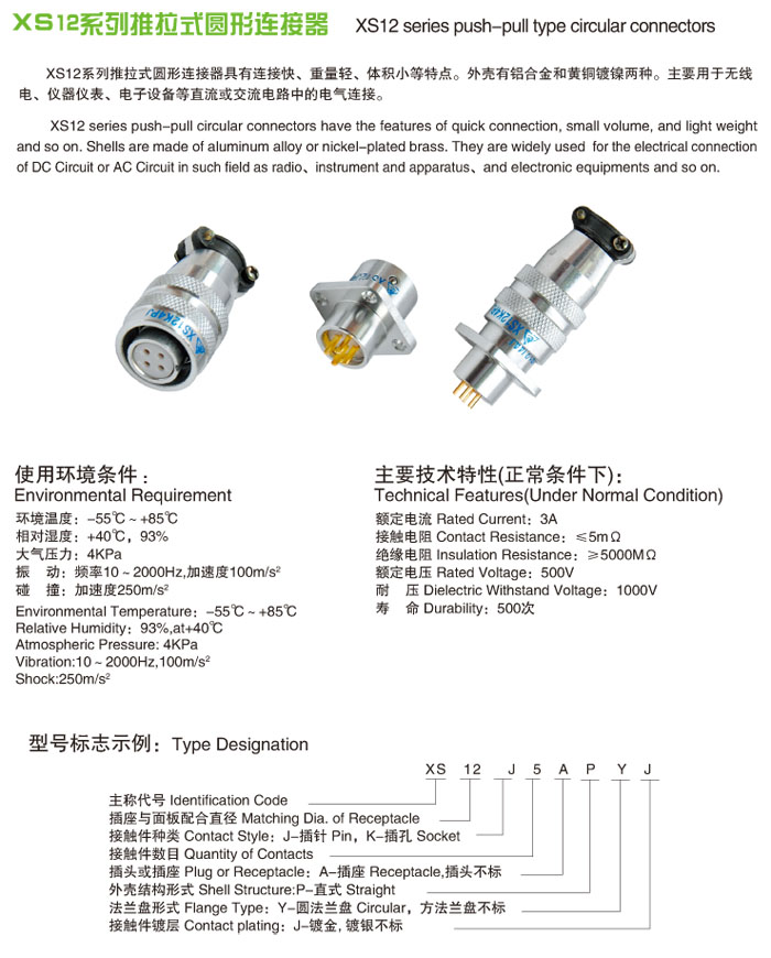 XS12J3AP 型推拉式航空插頭: