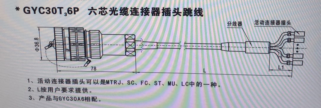 GYC30T36P-6FC-C6*6-3S5/0.3光纖連接器介紹 GYC30T36P-6FC-C6*6-3S5/0.3光纖連接器,看起來復(fù)雜,扯開說明一下,也許便于大家選用。GYC30是公司命名型號。 T3和T1都是表示尾部,長短不一樣。6FC-C6*6表示6毫米光纜線,帶6根跳線。3S5/0.3表示主線5米,跳線0.3米長。要說明 是光纜頭有多種型號,線長短可以選擇,不是固定的。